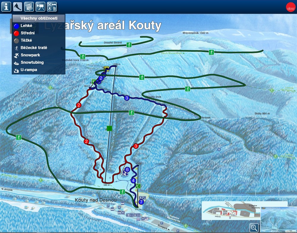 Ski areál KOUTY (11 km) nabízí nejdelší sjezdovku na Moravě!! Modrá sjezdovka má délku 3050 m, převýšení 520 m a nadchne hlavně rodiny s dětmi. Ski areál KOUTY - až 1095 m n.m., převýšení až 520 m, celková délka sjezdovek 11,5 km, šestisedačková lanovka o délce 1933 m, první v České republice (u horní stanice lanovky je občerstvení s posezením a toaletami), snowpark, půjčovna lyžařského vybavení, ski servis, lyžařská škola, dětský park, večerní lyžování, upravované běžecké tratě v nadmořské výšce 1100 až 1300 m - s možností návštěvy horní nádrže Dlouhé Stráně, dvě freeride zóny pro freeridové lyžaře i snowboardisty.