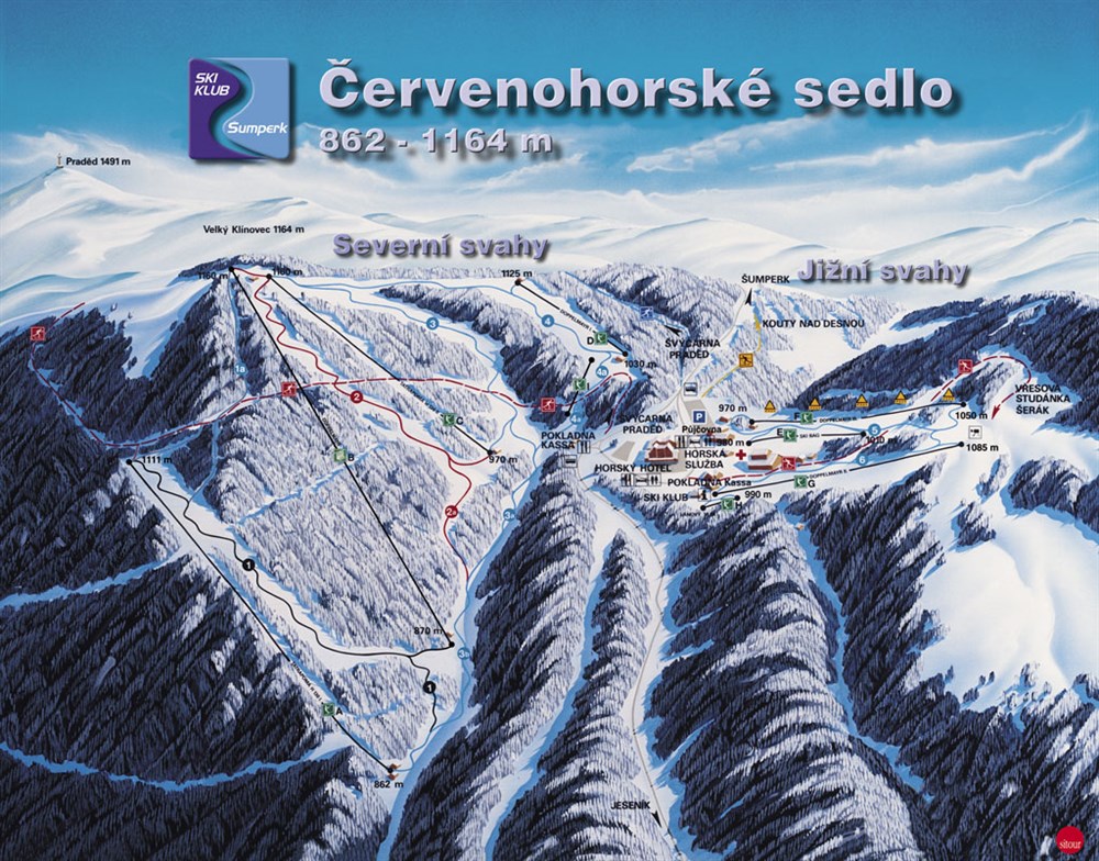Areál ČERVENOHORSKÉ SEDLO (20 km) - až 1164 m n.m., 4-sedačková lanovka, 6 vleků, 7 sjezdovek (i černá), celková délka sjezdovek 5 km, večerní lyžování, lyžařská škola a školka, půjčovna lyžařského vybavení, ski servis. Množství udržovaných lyžařských stop po hřebenech Jeseníků.