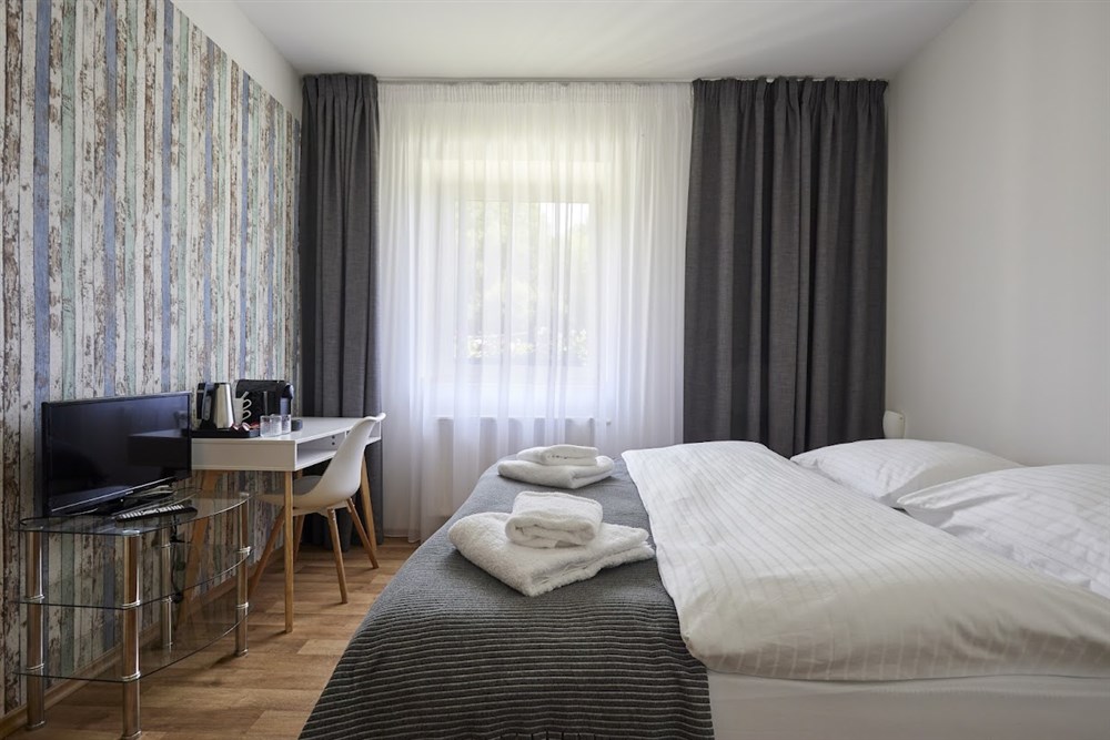 b) 2 - lůžkové pokoje DELUXE s možností přistýlky (rozkládací gauč), Spr.+WC, TV, set na přípravu kávy a čaje, balkon. Výhled je na travnaté hřiště a příjezdovou cestu, která je současně cyklostezkou.