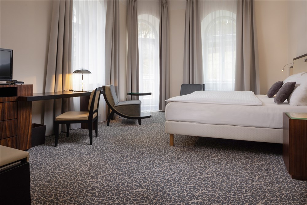 Směrem od Prahy po D5, exit 128 směr Planá, po silnici č. 21 do Mariánských Lázní, projet ulicí Plzeňskou a dále na Hlavní třídu, kde se hotel nachází. U hotelu je parkoviště (zpoplatněno)