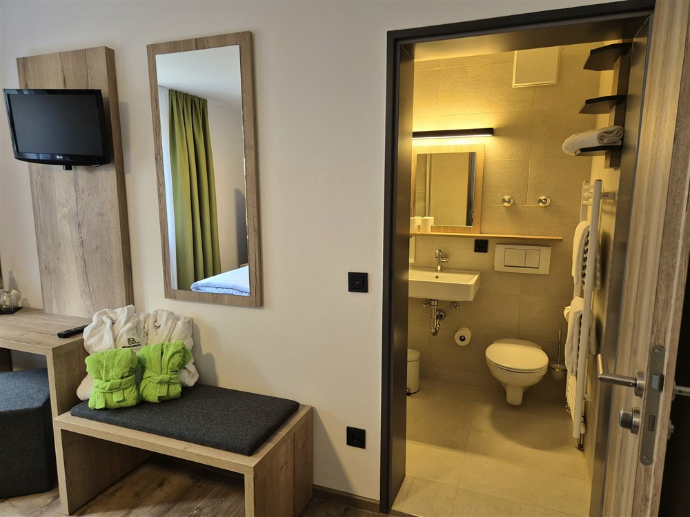 d) 1 - lůžkový pokoj COMFORT, Spr.+WC, kabelová TV, fén, trezor. Průměrná velikost pokoje je asi 14 m².