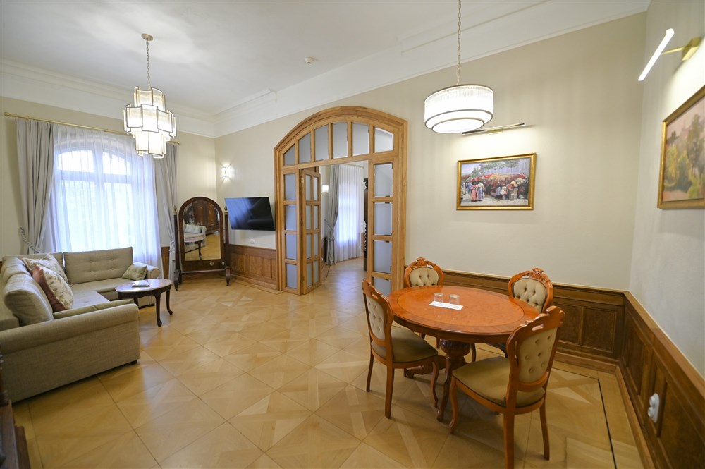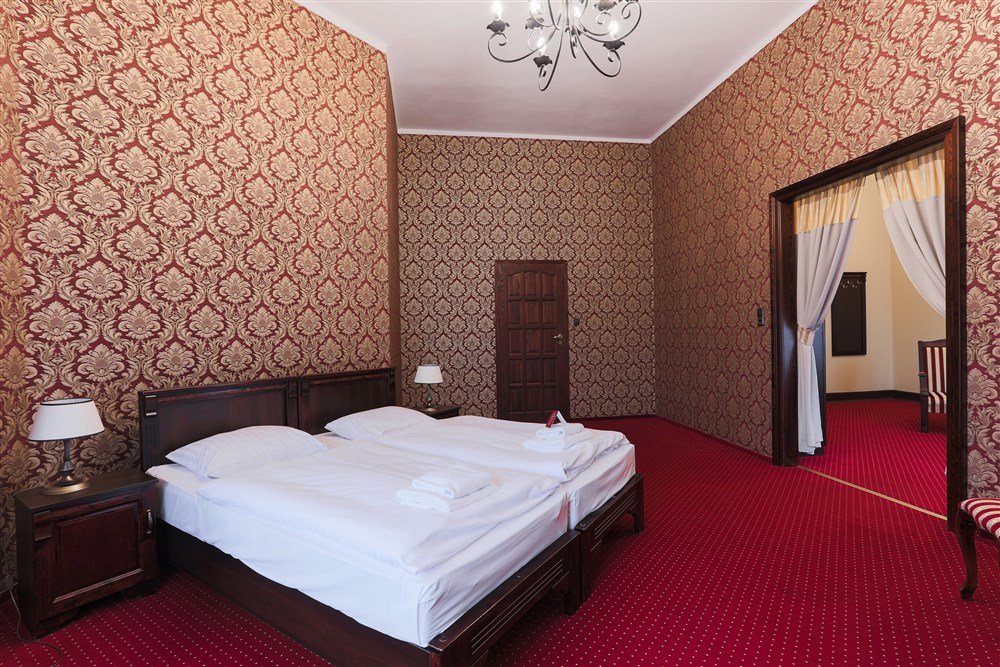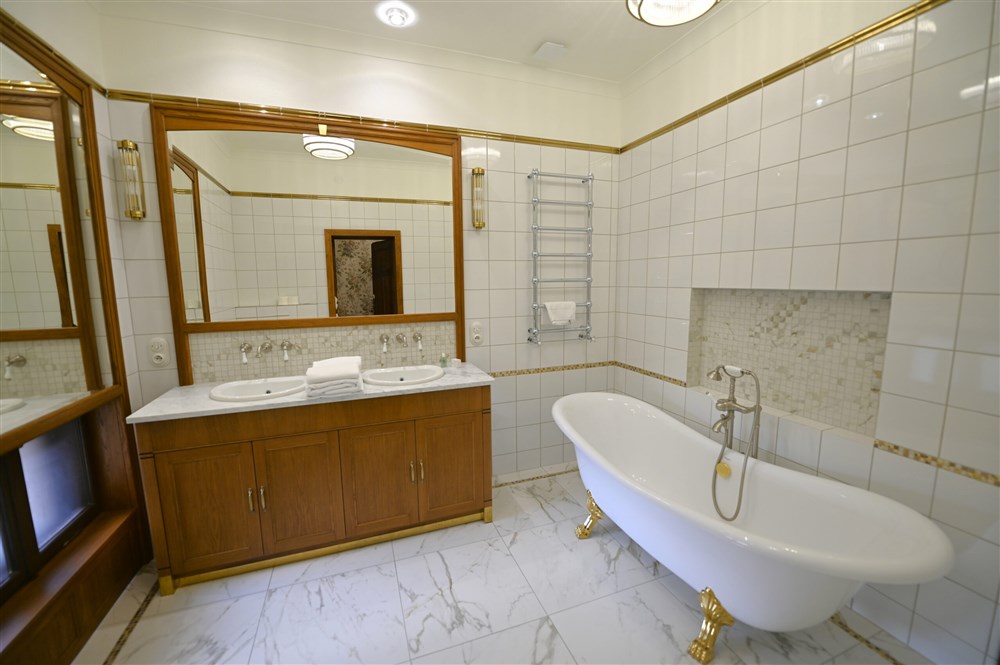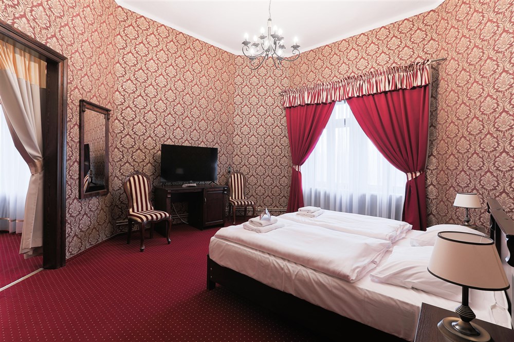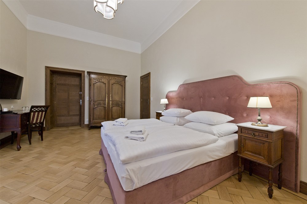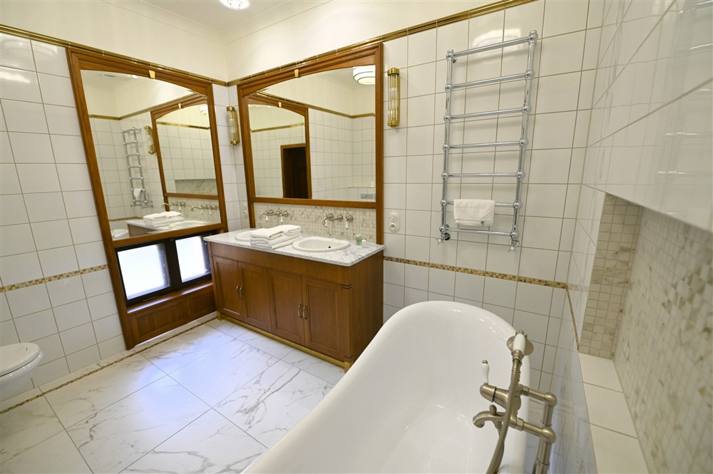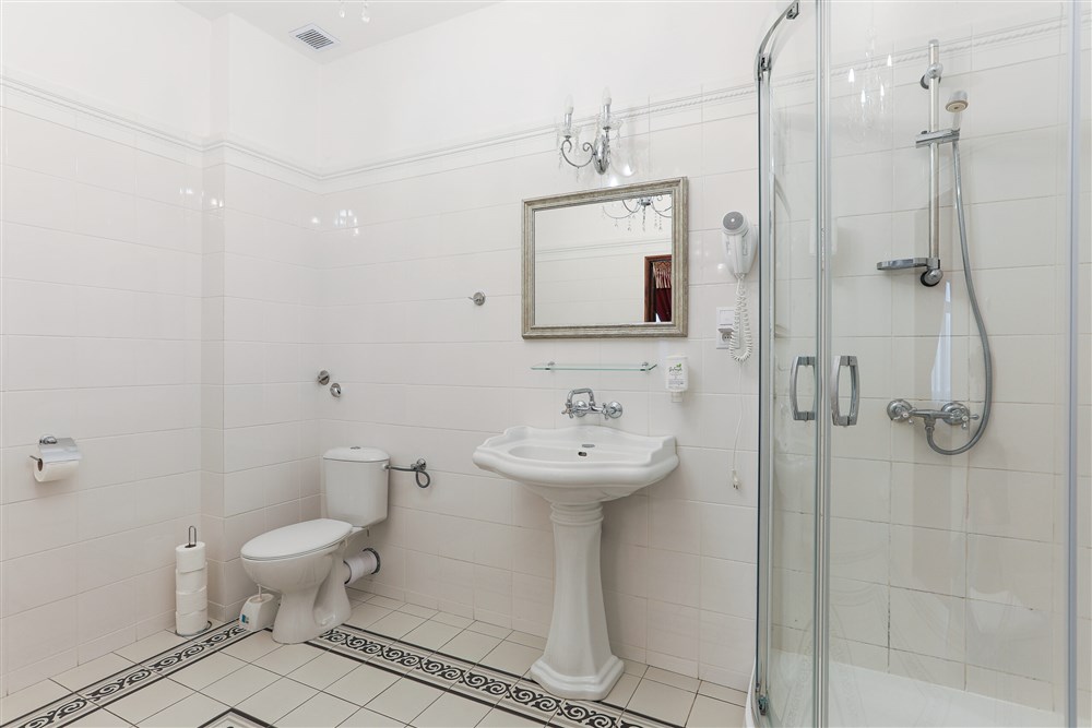Hraběcí apartmán pro 2 osoby (60m²), Spr. a vana+WC, TV, fén, příslušenství pro přípravu čaje/kávy, toaletní potřeby, ručníky
