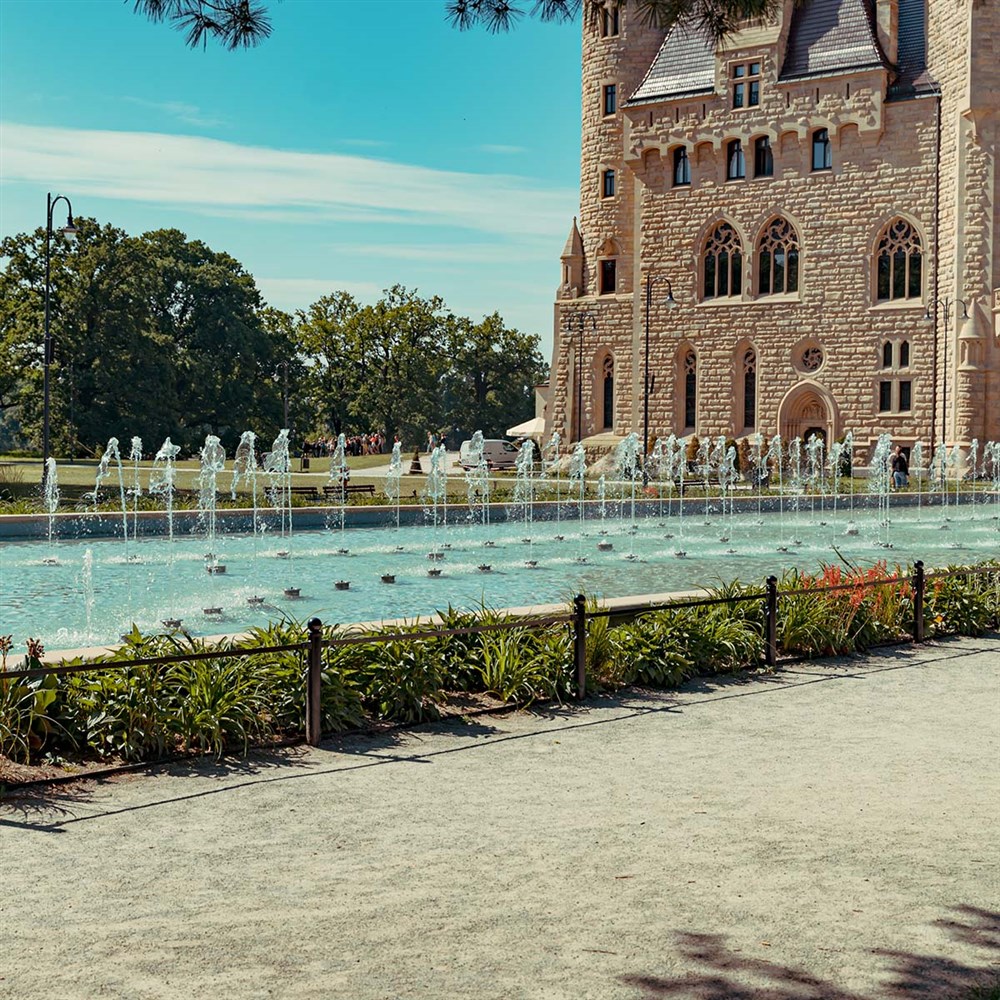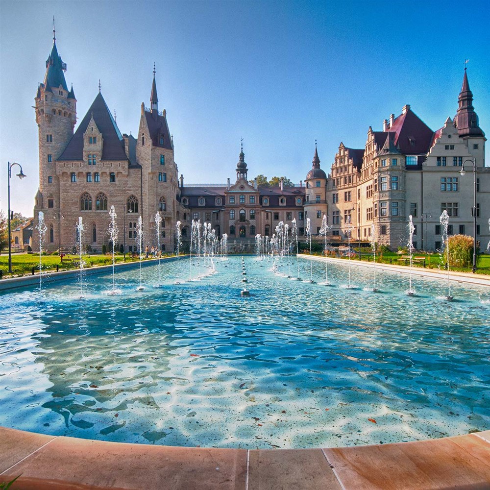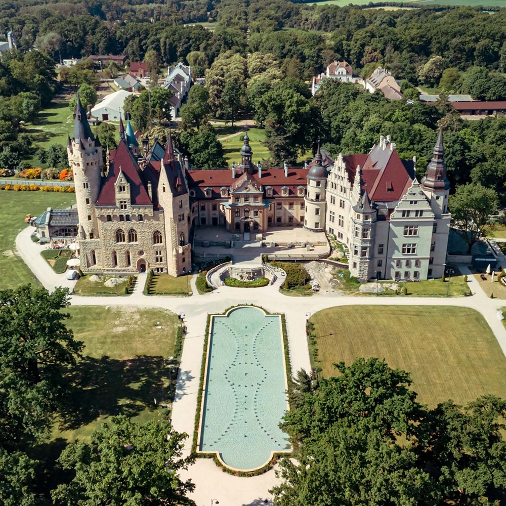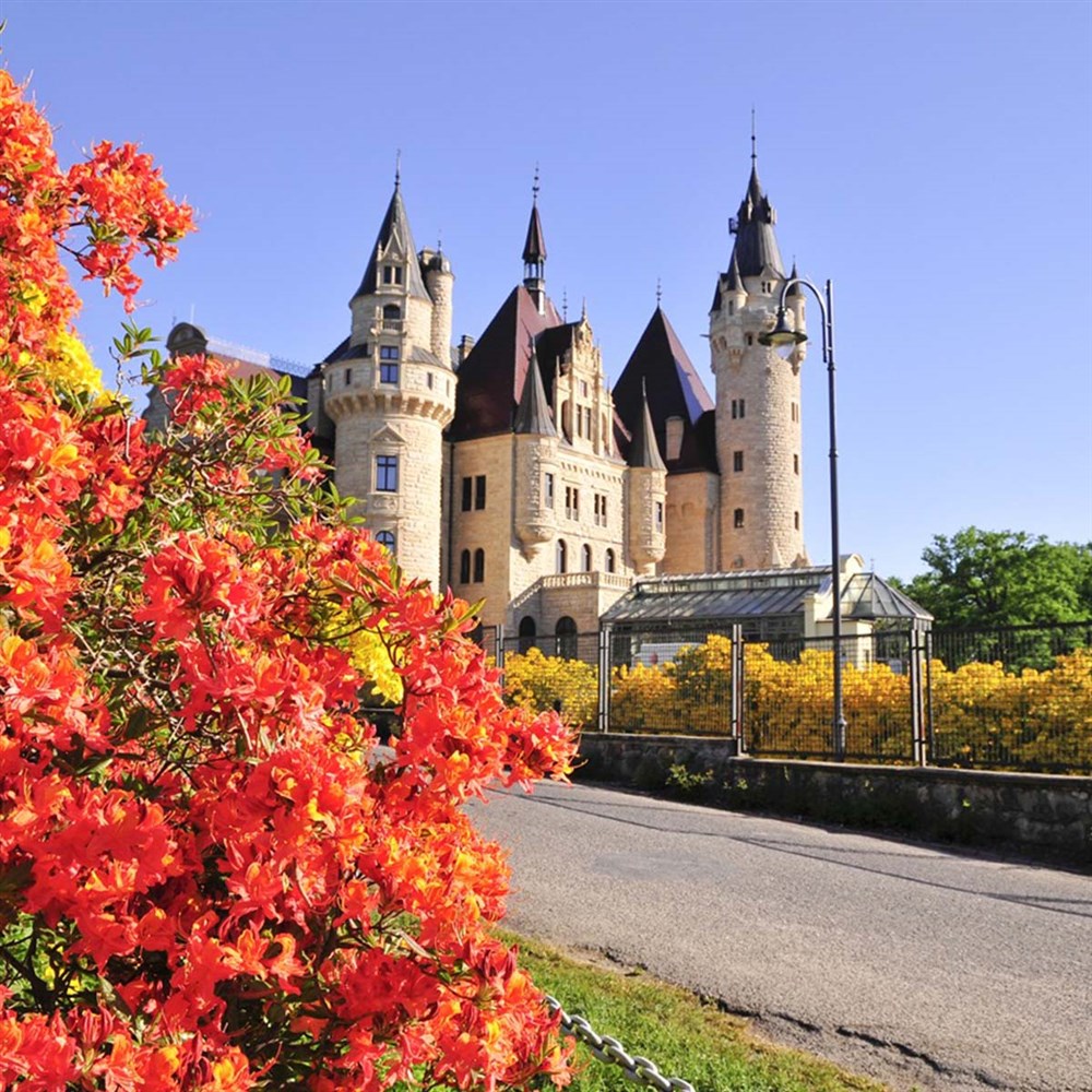 Zámek Moszna patří mezi nejznámější rezidence v Polsku – historická stavba s 99 věžemi a 365 komnatami, obklopená rozlehlým parkem a zahradami.