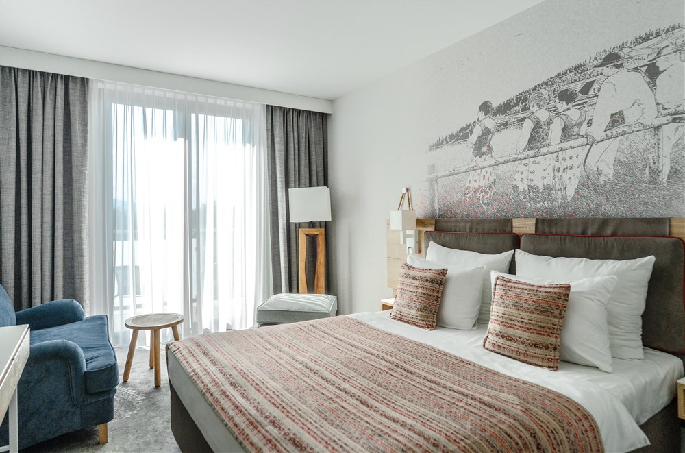 Apartmán s výhledem na hory (46 m²), ložnice s manželským lůžkem a obývací pokoj s rozkládací pohovkou (pro max. 2 děti do 11,99 let), vana+WC, LCD TV, minibar, trezor, fén, Wi-Fi, žehlící prkno + žehlička, sada na kávu/ čaj, klimatizace.
