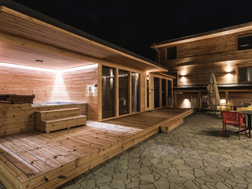 VENKOVNÍ WELLNESS (vstup pouze pro dospělé) - finská sauna, hydromasážní vířivka, ochlazovací bazén, tepidárium /odpočívací místnost/