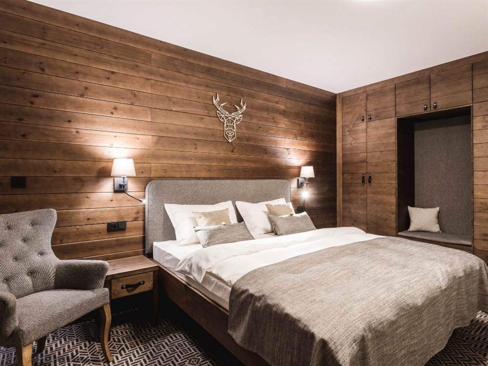 a) 2 - lůžkové pokoje DELUXE: Spr.+WC, SAT/TV, telefon, trezor, minibar, fén, Wi-Fi, župan, papuče, balkon