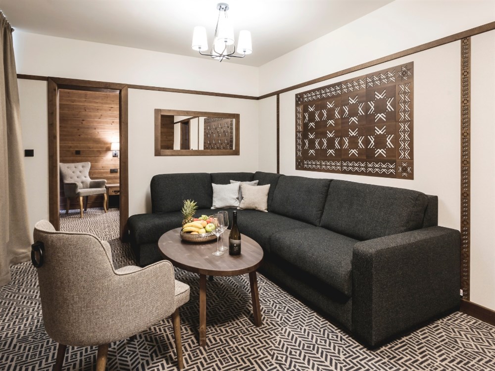 b) 2 - lůžkové pokoje DELUXE se 2 přistýlkami: Spr.+WC, SAT/TV, telefon, trezor, minibar, fén, Wi-Fi, župan, papuče, balkon. Přistýlka je rozkládací gauč, kde se pohodlně vyspí i 2 dospělé osoby.