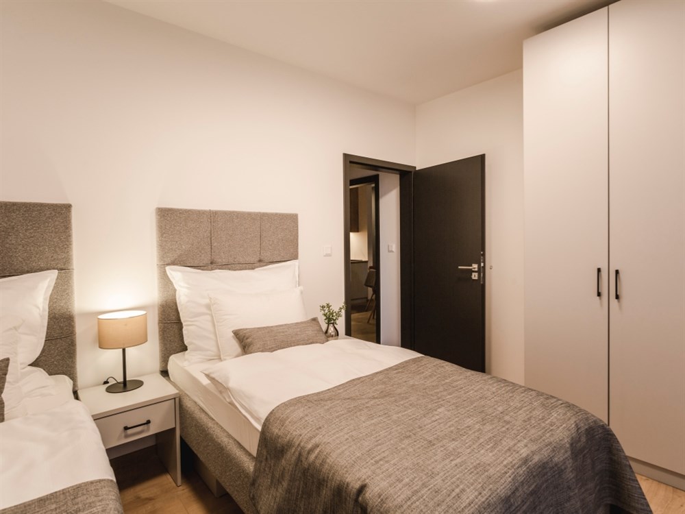 c) 2 - lůžkové APARTMÁNY se 2 přistýlkami: 2 koupelny (Spr./vana+WC), ložnice s manželskou postelí, obývací část s rozkládacím gaučem (pro 2 osoby) a kuchyňským koutem, SAT/TV, telefon, trezor, minibar, fén, Wi-Fi, župan, papuče, balkon.